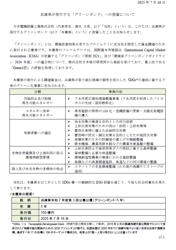 兵庫県が発行する「グリーンボンド」へ投資したことをお知らせします